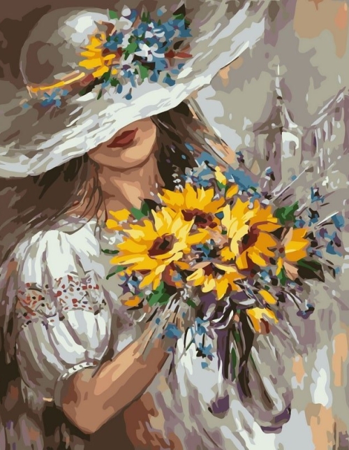 Tapyba pagal skaičius Mergina su skrybėle ir saulėgrąžų puokšte 40x50 cm