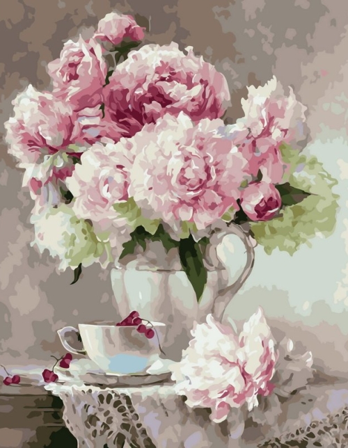 Tapyba pagal skaičius Bijūnų puokštė ir arbatos natiurmortas 40x50 cm