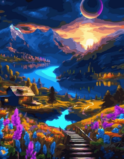 Tapyba pagal skaičius Kalnų slėnio namelis saulėlydžio metu 40x50 cm