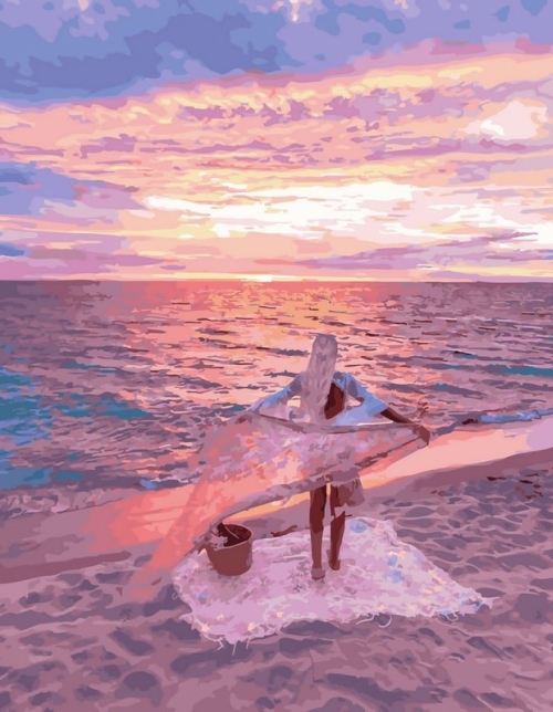 Tapyba pagal skaičius Švelniai rožinis paplūdimio saulėlydžio banglentininkas 40x50 cm